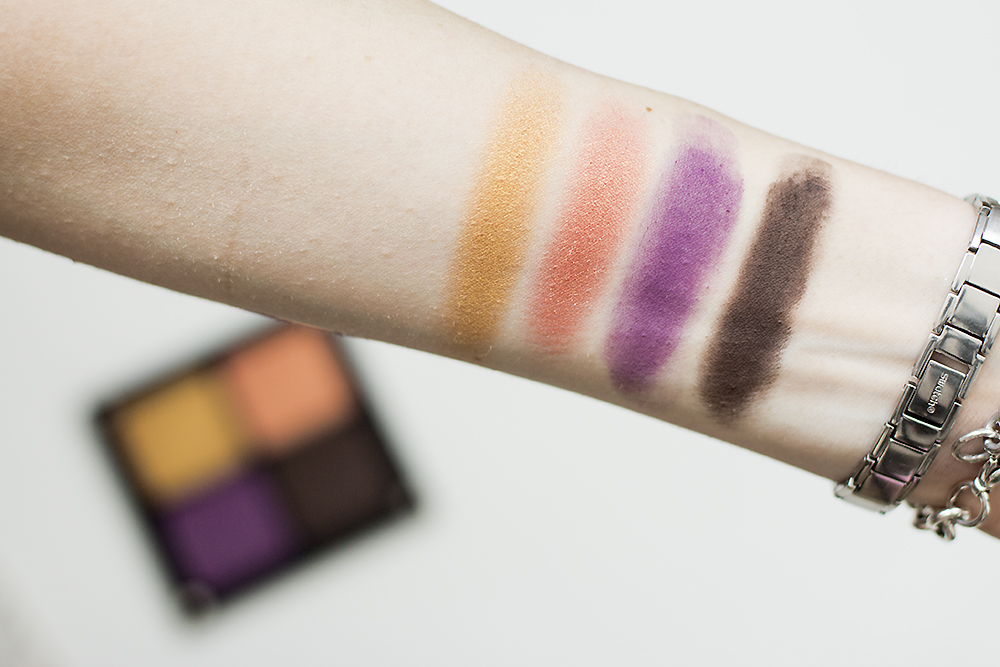 - Matte n°375: è un viola di media intensità opaco. Come moltissimi ombretti opachi e altrettanti ombretti viola risulta un po' difficile da utilizzare. Non è pigmentatissimo e questo rende la sua applicazione disomogenea. Non l'ho mai utilizzato sull'intera palpebra, lo preferisco come colore da piega o angolo esterno o, ancora meglio, come tocco di colore per sfumare un trucco sui toni del beige-marrone e renderlo più estroso. Bisogna fare attenzione perché può esserci del fall-out, quindi è meglio stratificarlo. Per l'uso che ne faccio non mi dispiace, si sfuma comunque bene.